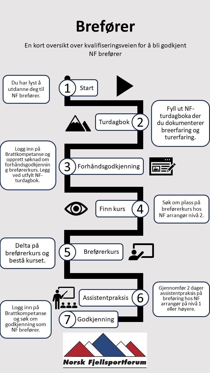 - Søk opptak til, gjennomfør og bestå NF breførerkurs direkte til NF-godkjent arrangør på nivå 2.
