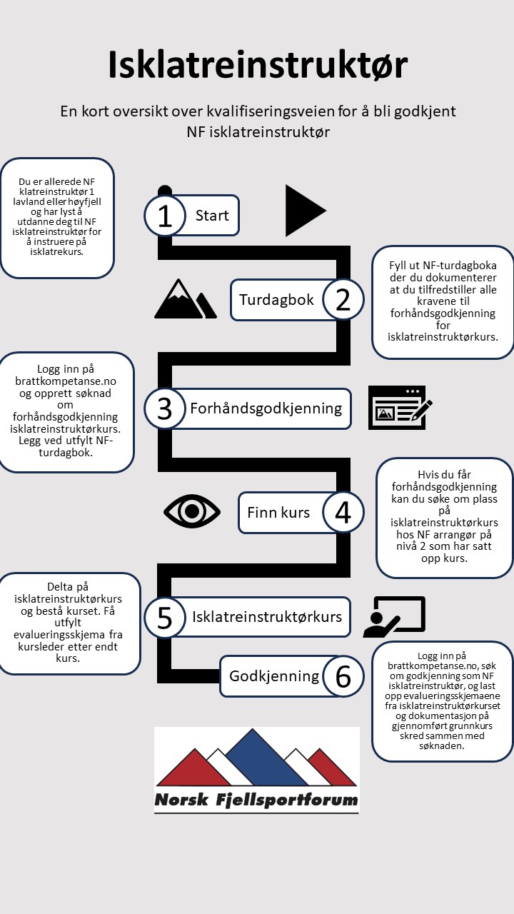 - Søk opptak til, gjennomfør og bestå isklatreinstruktørkurs direkte hos kursarrangør på nivå 2.
