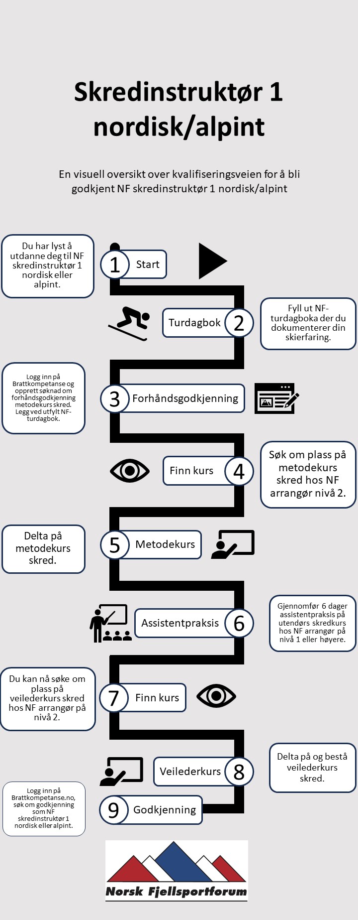 - NF har utviklet søknadsveiledere for de ulike utdanningsløpene. Disse er ment som hjelp for deg som ønsker å søke opptak til og sertifisering som skredinstruktør i NF. Se link til søknadsveileder under: